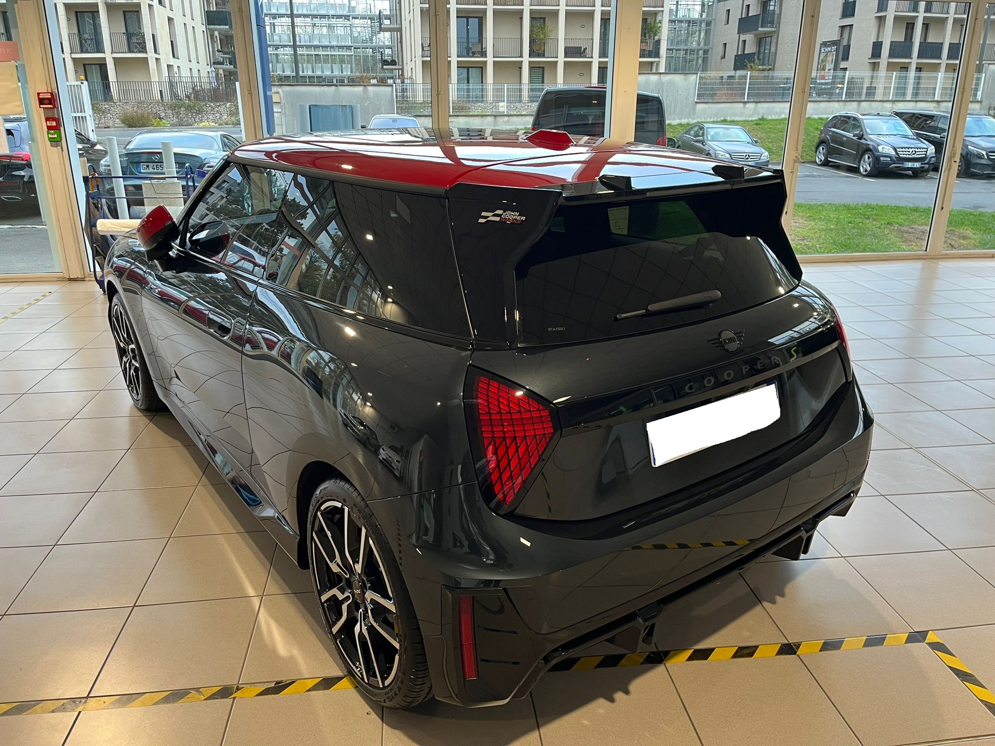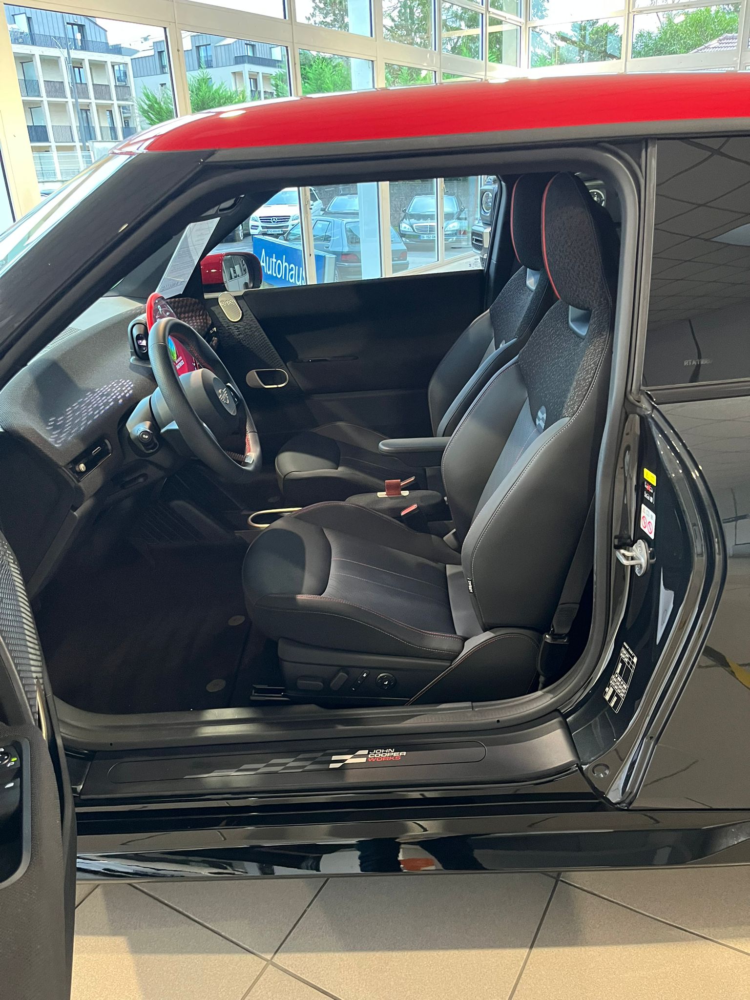 Finition JCW : volant chauffant, volant John Cooper Works, toit et coques de rétroviseurs rouge, freins sport John Cooper Works, ciel de pavillon anthracite, sièges avant John Cooper Works baquet, équipements supplémentaires spécifique JCW Trim